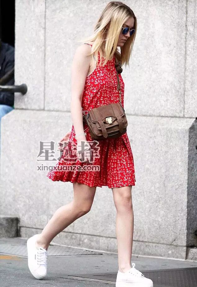 3、达寇塔.范宁,裙子来自Sea,球鞋来自Superga,包包是Proenza Schouler,墨镜是雷朋。