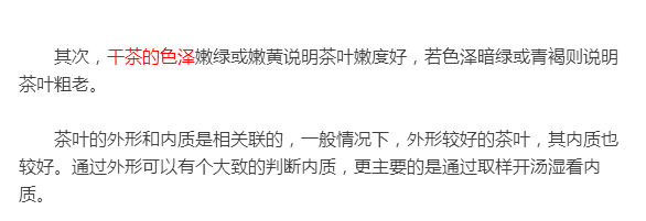 而后是会辨别新茶、陈茶。新茶即当年采制的茶叶,隔年的茶则称为陈茶或旧茶。绿茶以新鲜当年的为好,陈茶为次。