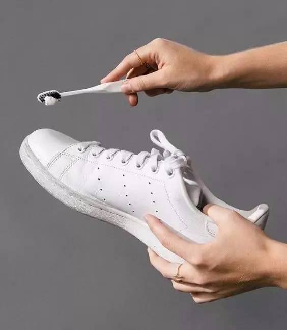 打湿鞋子后,在鞋子表面涂上一层牙膏,然后用软毛刷打圈圈刷洗,同样静置5分钟后,再用清水冲干净,你会发现污渍不见,鞋子亮白如新~