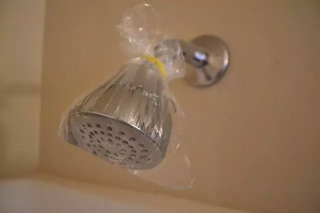 拿一个塑料袋或者保鲜膜,倒入白醋和清水,用橡皮筋绑稳在淋浴头上,浸泡两小时后,再打开冲洗干净即可。