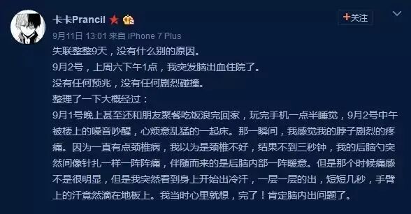 这两天微博有个叫卡卡的年轻网友脑内忽然出血,引发不少人的关注。