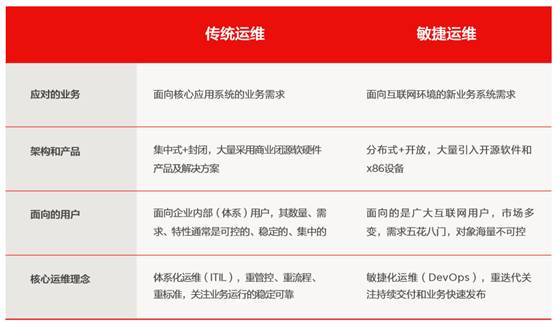 相对于传统运维,敏捷运维是技术导向而非流程导向、强调对外价值输出而非强调对内服务输出、强调敏捷而非强调规范。