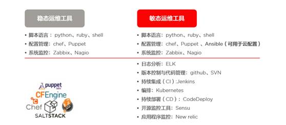 敏捷运维中用到的工具要远多于传统运维。除了传 统运维中要用到脚本语言、配置管理工具和系统监 控工具,敏捷运维中还要用到日志分析工具(ELK)、 版本控制与代码管理工具(github、SVN)、持续 集成工具(Jenkins)、编排工具(Kubernetes)、 持续部署工具(CodeDeploy)、开源监控工具(Sensu)、应用程序监控工具(New relic)等等。
