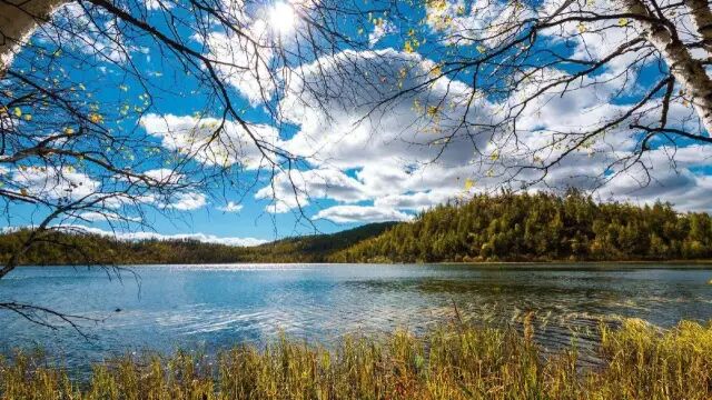 感受蓝天、白雪、彩林、湖泊的交相辉映,