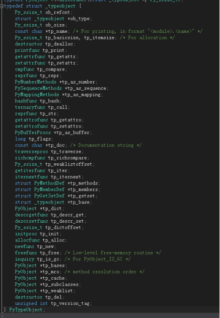 Python类型在python实现中,用PyTypeObject 实例来描述。Python类型有很多种,每一种类型,都用一个PyTypeObject实例来描述。例如整数类型用PyInt_Type描述,string类型用PyString_Type描述,PyTypeObject中主要存贮了特定Python类型的方法,方法以函数指针的形式存储在PyTypeObject的结构里。
