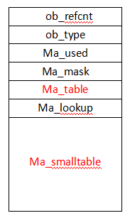可以看到,PyDictObject 一个定长的python对象,注意到PyDictObject中有两个重要的成员,Ma_table 和Ma_smalltable。Ma_table 的作用和list对象中Ob_item的作用是一样的,指向的是真正保存字典元素的空间,当字典中的元素个数小于8时,这片空间就是Ma_smalltable数组!而当字典元素大于8时,系统会另外申请新的内存空间,并将ma_smalltable的内容拷贝过去,最后使ma_table指向新的内存空间。