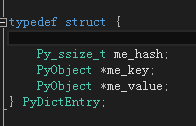 PyDictObject 保存的元素是一个pyDictEntry, 显然这是一个键值对,其结构如下