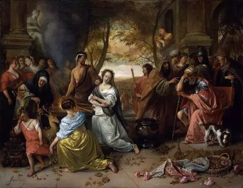 整个画面是秋天的萧条,伊菲姬尼以跪姿斜着脖子,平静等待献祭,阿伽门农的悲伤扶额却没看到他的多少悲伤,众多围观者中除了小孩不忍直视以外,其他人感觉就是来凑热闹,因为画家想要表现的重点是场景的动态情境。