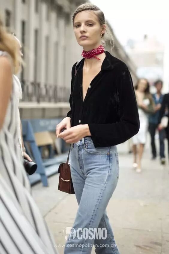 开领的丝绒质感衬衫也很适合搭配颜色较浅的牛仔裤,再搭配一些亮色系的配饰点睛。