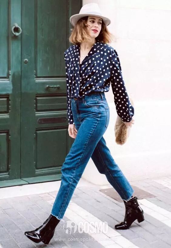 衬衫牛仔裤,再搭配一顶小礼帽和一双亮面漆皮短靴,更加时髦有范。