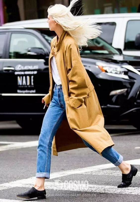 秋冬,牛仔裤加大衣绝对是个万能时髦公式,特别是初秋,风衣风潮再度袭来,牛仔和风衣都十分随性实穿。廓形风衣比较适合紧身的小脚牛仔裤,全身搭配不至于失衡。