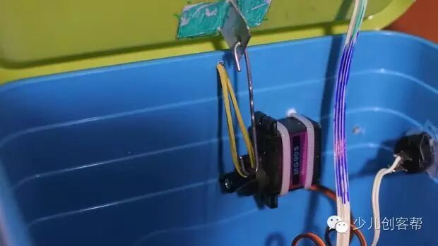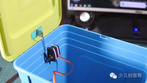 舵机性能比较弱,因为重力的原因盖盖比开盖快的多。我们用最简单的蓄力装置,橡皮筋来解决。盖盖的时候橡皮筋被拉开,比较慢,开盖的时候收缩,帮助舵机打开盖子。