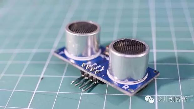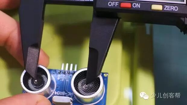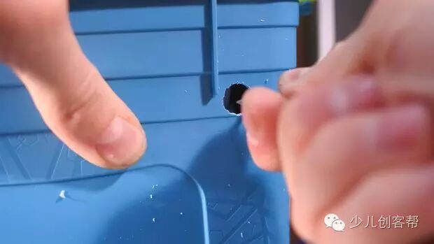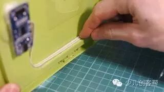 接下来我们安装超声波传感器,测量传感器的尺寸并且在盖子上做记号然后大空。把导线接到传感器上然后用热熔胶固定到盖子上。