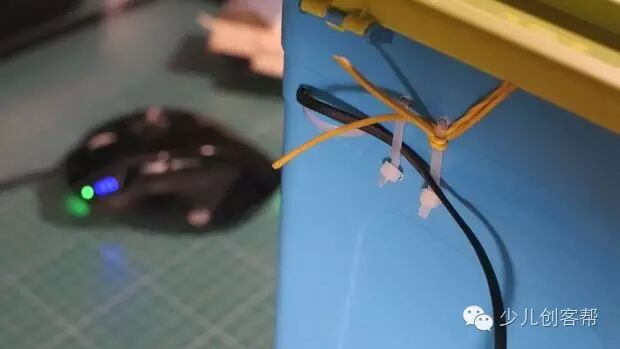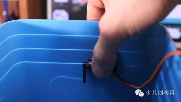 在垃圾桶上标出舵机轴的位置,和草图要一致。先把舵机用胶带临时固定,然后在桶上打四个孔,用绑带把舵机绑在垃圾桶上