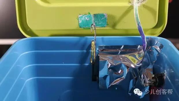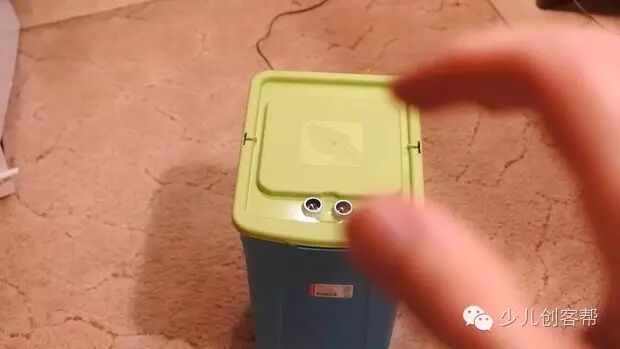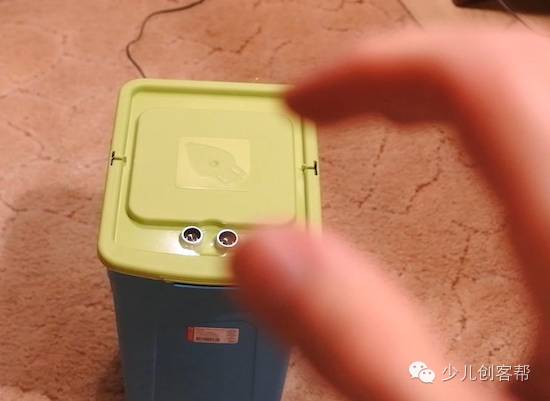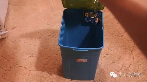 在垃圾桶一侧开一个孔安装开关,把导线焊到开关上并且安装开关。