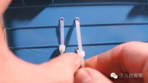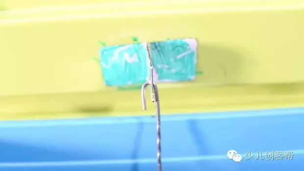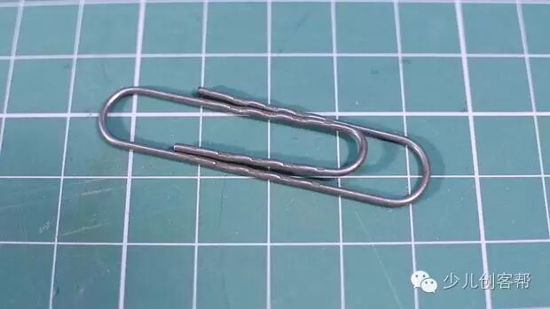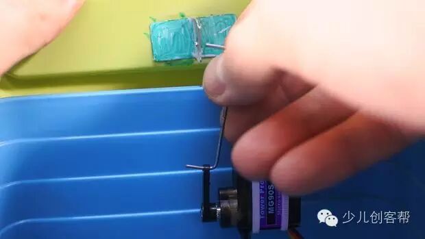 然后用纸做了一个轴,然后用曲别针把舵机和合页连接到一块。最后在回形针末端弯一个勾固定。