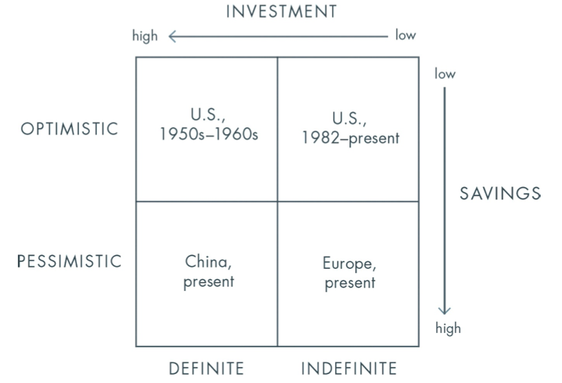 对未来不明确的悲观主义者:一个对未来不明确的悲观主义者看到的未来是阴郁的,但却是束手无策的,所以这种人会喜欢把钱存起来以应对不明确的未来,却也正是因为未来的不明确而不会去进行投资。作者举例说当今的欧洲就是这种情况。