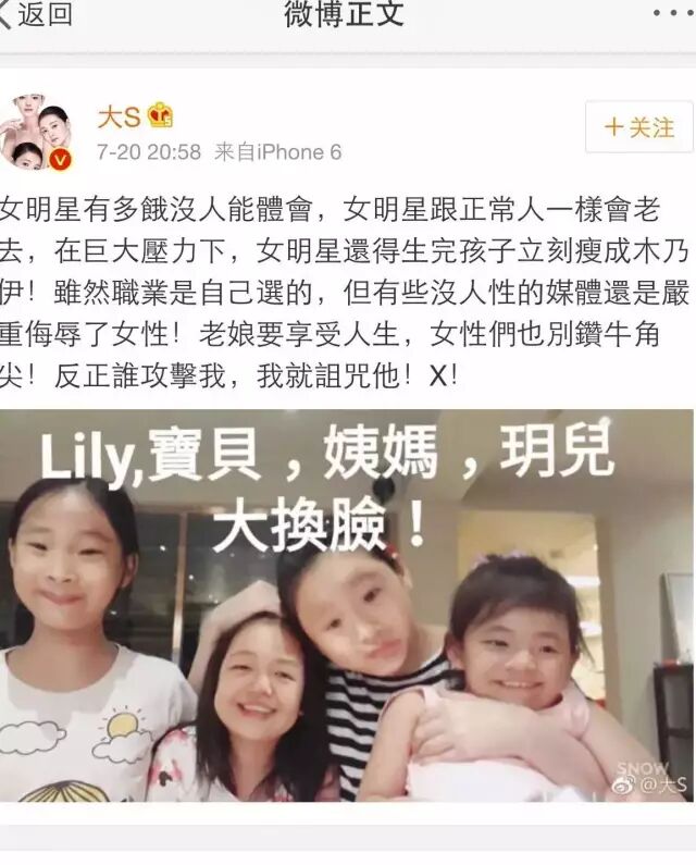 在活动当晚,有不怀好意的记者提起大S近日身材发福的事情。小S当场怒怼了回去,直说:“不要再烦我姐了好不好!有些人体质较不易瘦,不要把她逼那么紧好不好,不要再攻击我姐了。”