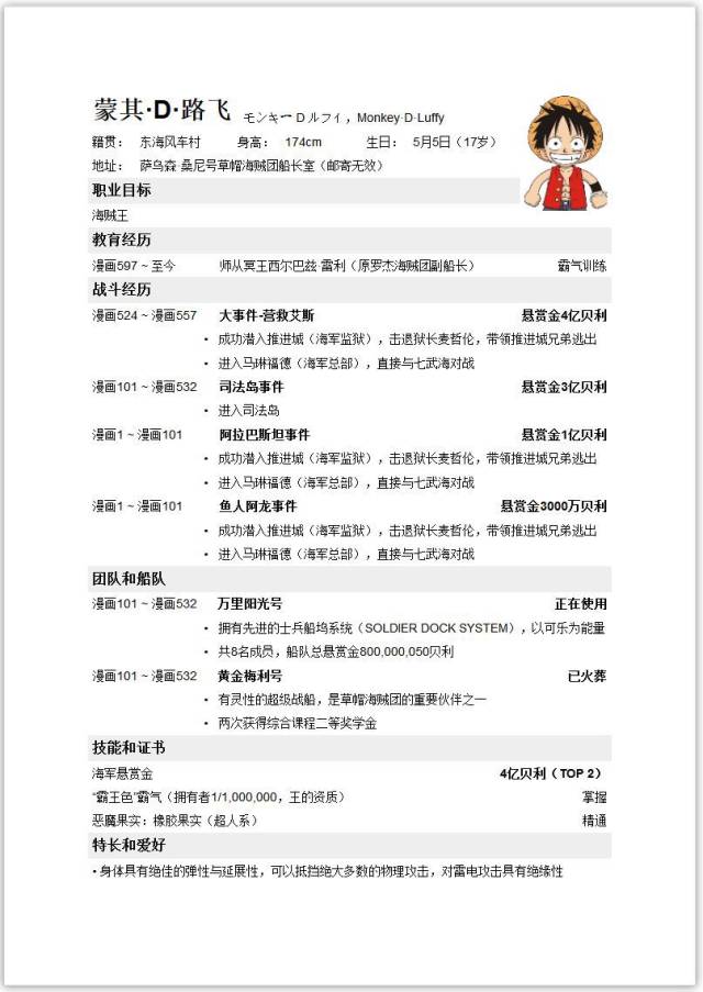 最后的最后轻松一下吧,来看看路飞的简历,看看他是怎么申请海贼王这个职位的?