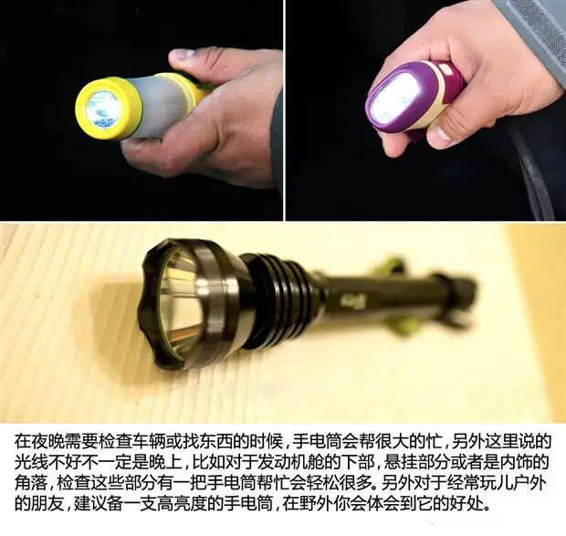 手电筒是很有用的工具,在光线不好的情况下可以帮助照明,在夜晚需要检查车辆或找东西的时候,手电筒会帮很大的忙。