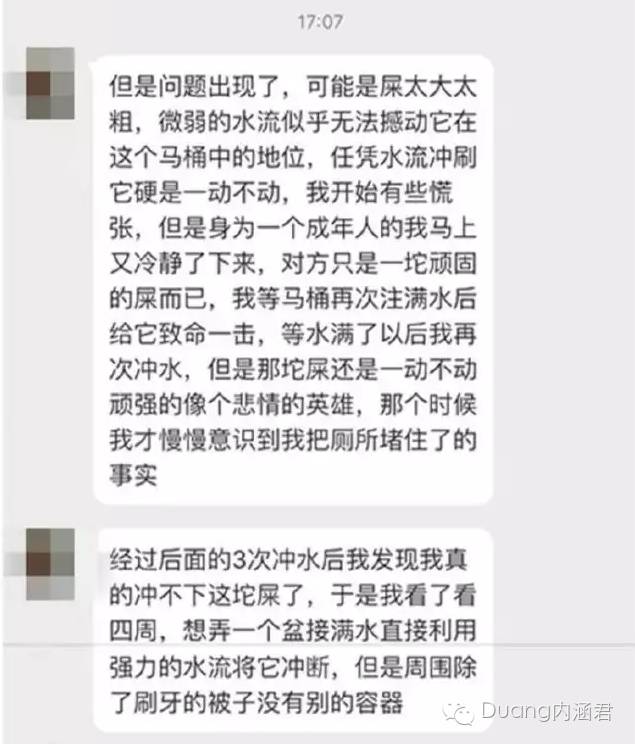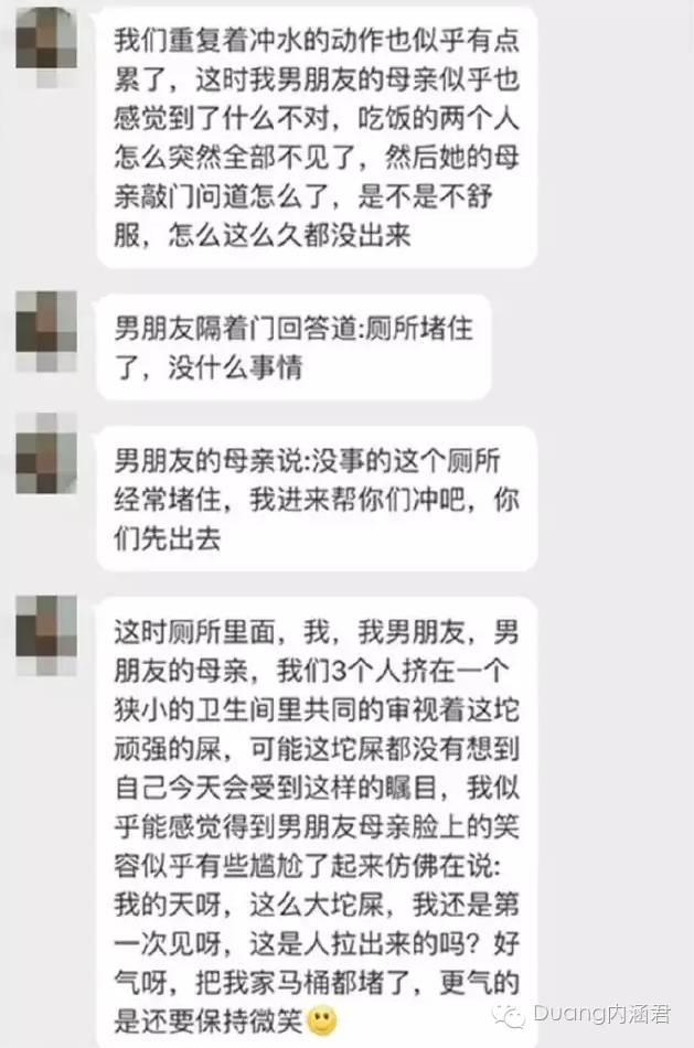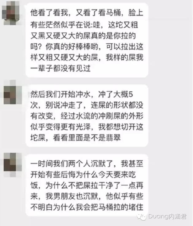 八、近日,一则“拉屎把男朋友家厕所堵住了”的帖子疯传朋友圈,让很多人都笑出腹肌来。内个,我们先来回顾下整个事情的经过!