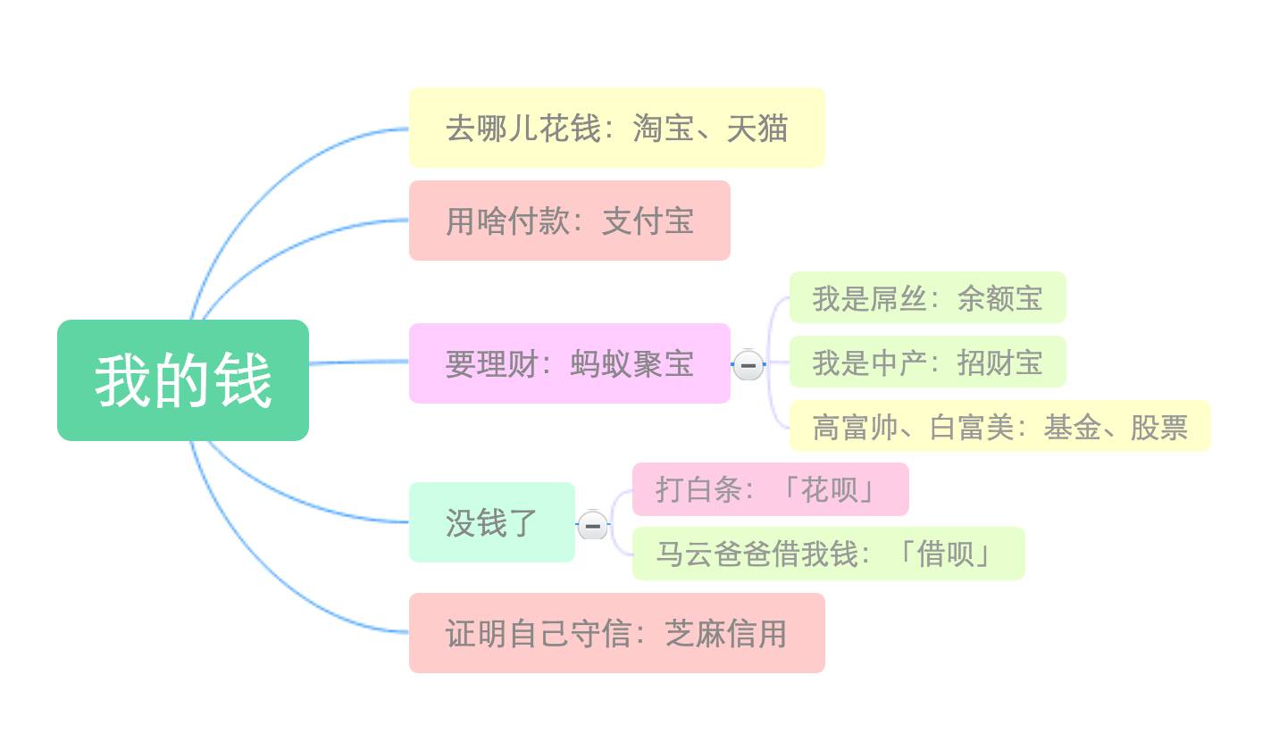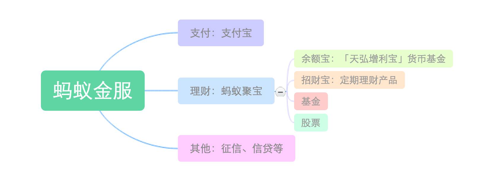 现在,商场里除了数码产品还卖生鲜、服装等商品,五花八门。商场管理者蚂蚁金服发现,人们需要一个专门选购电器的商场(类似苏宁、国美),于是在“支付宝 App”商场旁边新建了一个商场。在这个叫做“蚂蚁聚宝App”的新商场里,除了“iPhone、数码产品”,还卖其他各种“电器”。