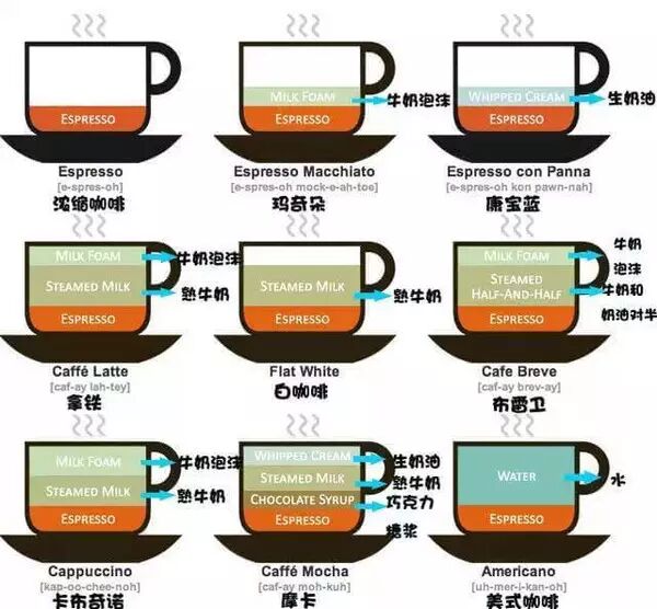 先看这张图,这张图很清晰明了地介绍了几种咖啡之间的区别与联系。