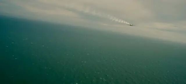 直到一个镜头切到三架英军喷火战斗机飞过老爷子驾驶的渔船,「海」这时变成了广袤与英勇的战场。诺兰在这里用不同视角的画面一遍遍演绎战斗机击毙敌机,水上迫降,老爷子闪躲德军侵袭的场景,用多视角镜头的拼接,紧凑的节奏,天与海背景的反衬,演绎最辽阔的孤胆。