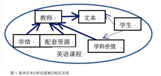 影响教师作文本分析的要素大致分为内部因素和外部因素两个方面。内部因素主要包括教师自身的知识结构、知识积累、和人生见识等影响教师认知的背景;而外部因素主要是课堂因素,如学生、教学资源、学科价值等。这些因素的相互关系见图 1。