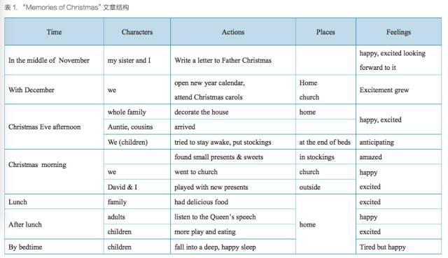理解语篇结构能够帮助学生快速把握文本的脉络,从而准确理解全文。理解段落与段落之间的关系。语篇标记词(discourse markers)的知识通常能够有效帮助学生把握文章结构。例如表顺序的词(sequencing),“Memories of Christmas”一文中的“With December our excitement grew each day, On Christmas Eve, Christmas morning”等时间状语,或其他文本中的顺序词 first of all, next, atthis point, in conclusion等,使用文章结构图或思维导图通常能够使文章的结构更为直观(见表 1)。