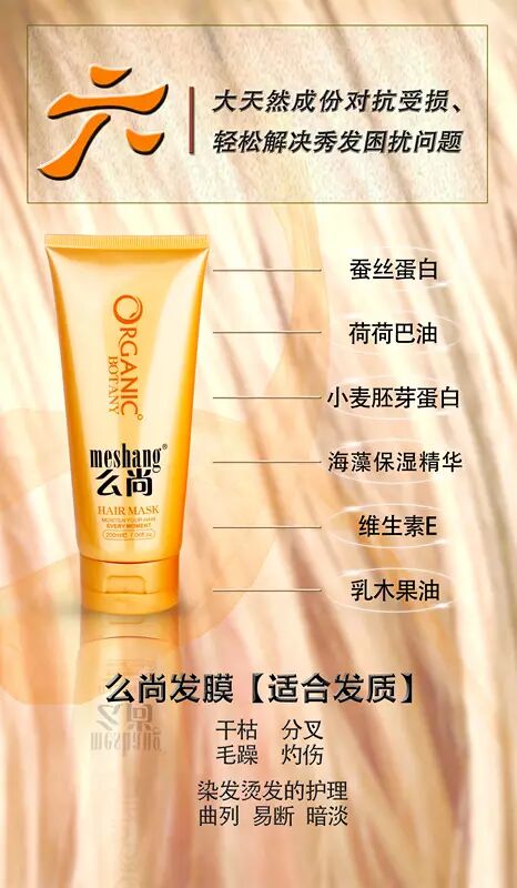 好头发,么尚养!产品功效:么尚营养发膜是一款浓缩型发膜,提取天然6大养护成份,高浓缩精华深入渗透,直达发芯。有效修复烫染及日常环境所造成的秀发损伤,帮助秀发对抗干枯、毛躁、分叉、暗哑、脆弱、蓬乱等一切苦恼问题。令秀发瞬间轻盈柔软 无惧伤害,效果看得到。