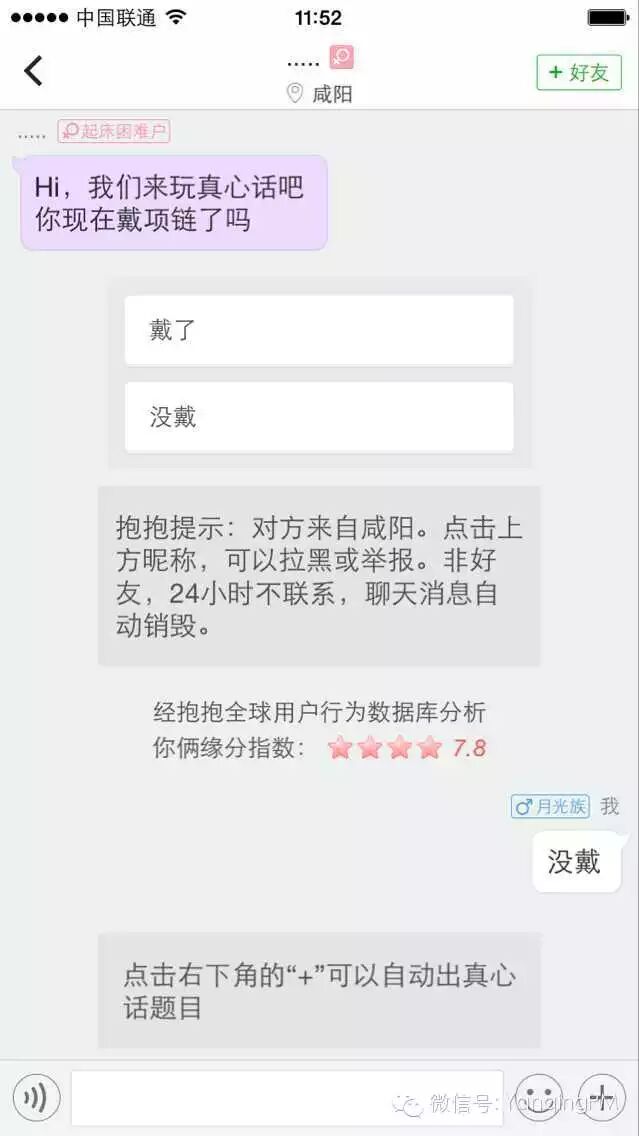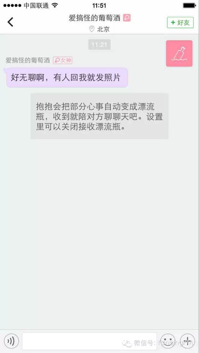 进入主界面后,聊天页自动接收到多条消息,我可以直接和他们聊天,降低了寻找朋友的难度,回想第一次打开微信,第一屏空荡荡的让我摸不着头脑,好点的比如陌陌会有一条系统消息,但是对用户的帮助基本为零。说回抱抱,这些自动接收的消息来自于漂流瓶、同城动态,抱抱会把它们以消息的形式发送给新用户,用户之间可以直接聊天,在24小时之内如果不联系且非好友,消息将自动销毁。抱抱通过此功能解决了新用户与陌生人建立联系难、找合适话题难的问题。如果还是没有共同话题,还可以通过功能“经典真心话”和“大冒险”将交流进行下去(抱抱对添加好友也有一系列的促进机制,比如如果想使用功能“私密真心话”就必须添加为好友等,下次详聊)。体验下来觉得功能很实用,抱抱的产品经理一定很了解人性,很想认识一下。