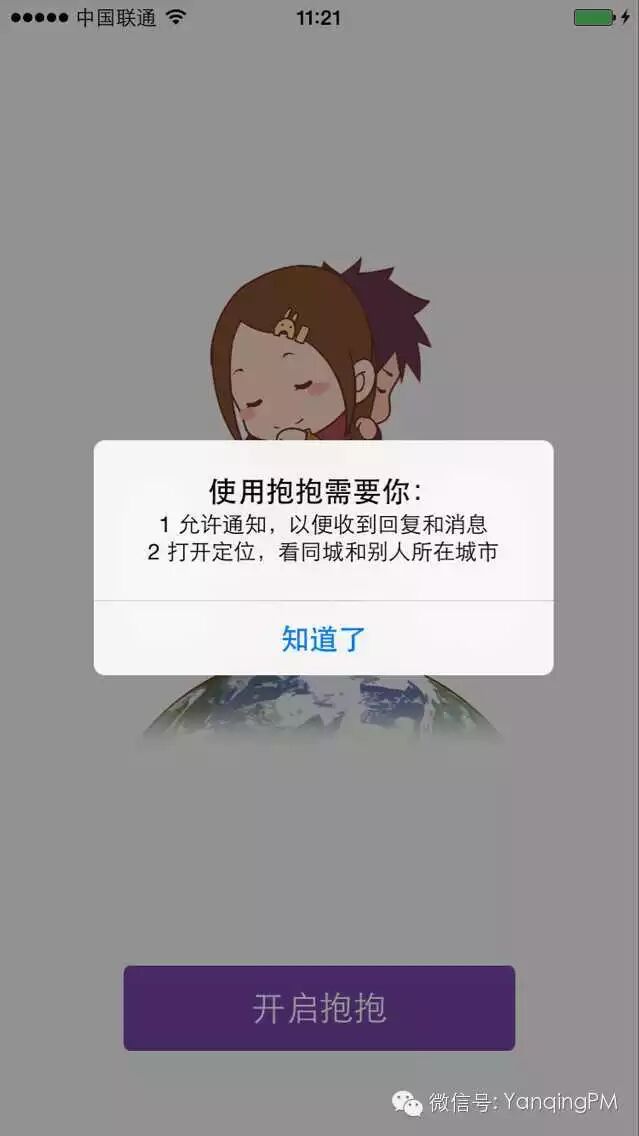 最近在体验app“抱抱”,它是近半年来给我最大惊喜的一款陌生人社交类应用。当我第一次打开它时,先弹出应用内提示:使用抱抱需要允许通知和打开定位(如果用户选择不允许会影响app的部分功能和体验),点击知道了之后,才会弹出系统提示:允许通知和定位,两次提示的优点在于提高用户打开权限的概率,如果用户关闭后再次打开的成本会更高,所以在第一次弹窗时下文章。之后用户需要选择性别和标签,这样所有的设置都完成了,用户在操作时基本无压力。