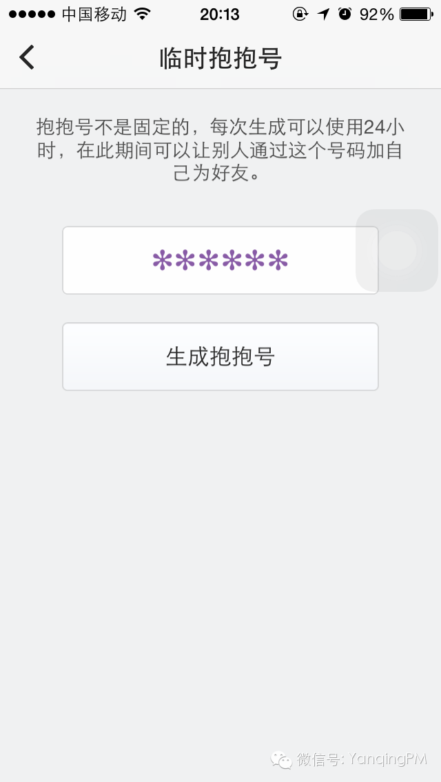 最近发现两个小细节:没有注册意味着没有账号,两个没有账号的用户在线下如何加为好友呢?抱抱通过功能“临时抱抱号”生成一个24小时之内有效的临时抱抱号,在此期间可以通过它来加好友。如果在聊天页多次刷新,你的联系人会全部出现在聊天页,一开始我以为是bug,现在想想是我天真了。
