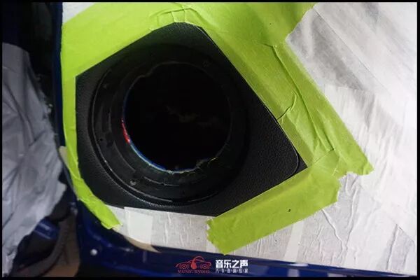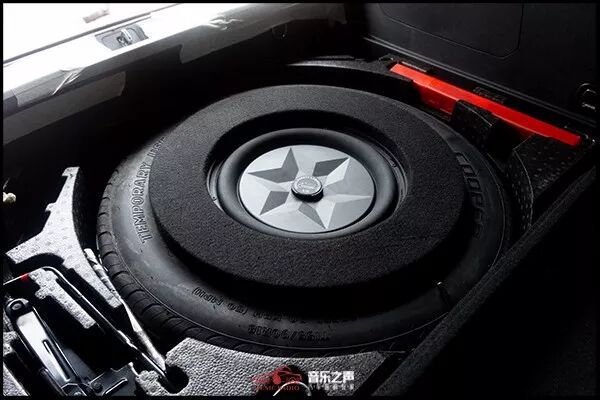 尾箱备胎安装UK暴风13备胎低音炮,不占空间又隐藏,其低频效果惊人,配合音乐能力强,通透干净,是需要低频效果弥补的系统里完美的补充。开好木圈包好绒布为低音炮做好防护。
