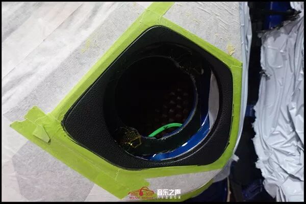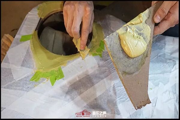 想要获得更好的声场音色,倒模很关键,倒模前,将周围保护好避免在施工时刮花或弄脏;在中低音喇叭位补灰塑形,经过反反复复的打磨修整后进行包皮。粘贴密室音源扩散板,增强箱体内音源扩散功能,提升喇叭的中低频全面发挥和表现。