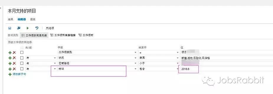 当然对于第二种方式,是有一种补救措施的,即运用从TFS2013起就有的对工作项打标签的功能。参加下面示例,在查询条件中增加对标记的查询: