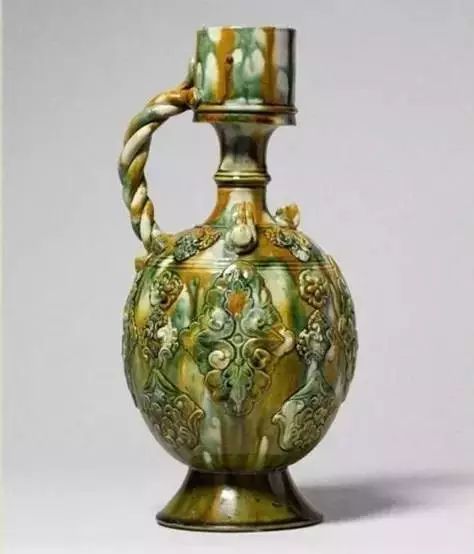 唐三彩贴花双系绳柄壶