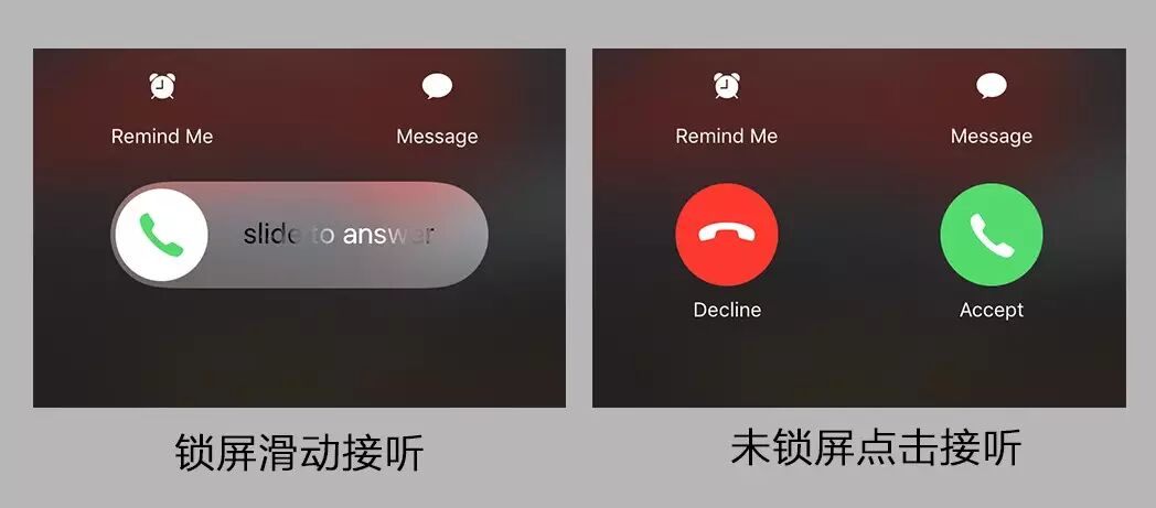 如果设备是锁屏时候,接听电话的方式是滑动接听,如果是未锁屏状态下是点击接听。