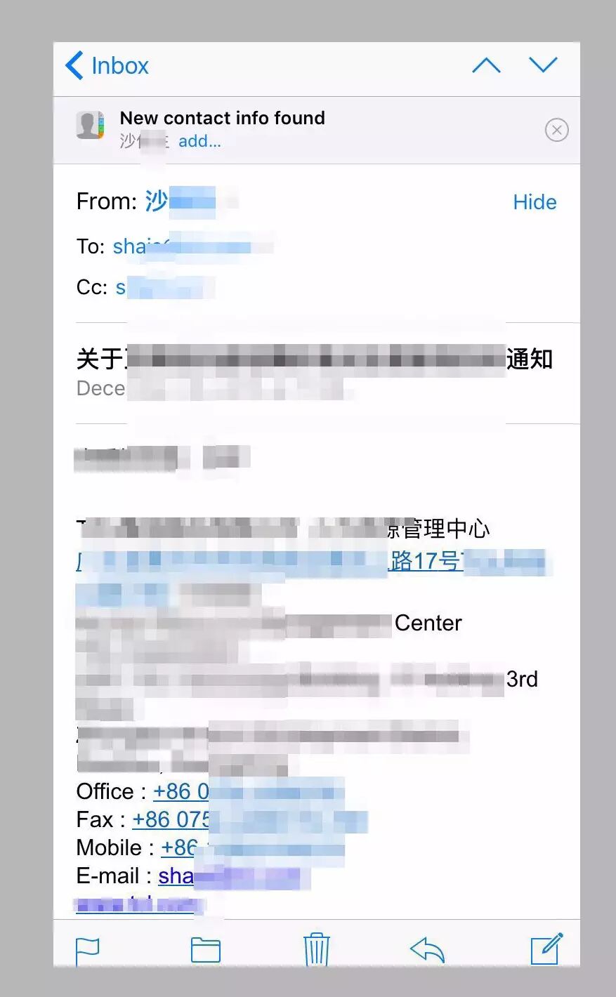 如果邮件里面有对方的个人信息,iOS会在邮件顶部提示你添加该联系人到电话本。