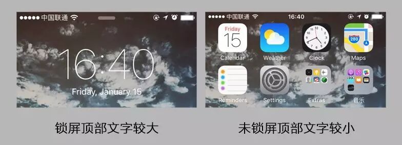 在锁屏的时候顶部的字号和图标都比未锁屏的要大。