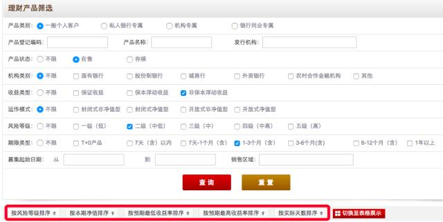 方法是这样的:当你查询一个理财产品后,就会出现一个理财产品的筛选页面,就是下面这个样子👇