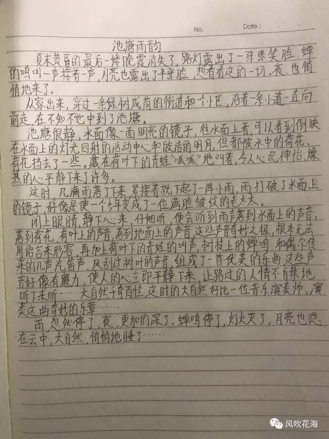 闭上眼睛,静下心来,仔细听,你会听到雨声落到水面上的声音,落到荷花、荷叶上的声音,落到地面上的声音,这些声音奇妙之极,根本无法用语言来形容,再加上荷叶下的青蛙的叫声,树枝上的蝉鸣和偶尔传来的几声汽笛声,风刮过树叶的声音,组成了一首优美的乐曲,这些声音好像有魔力,使人的心立即平静下来,让路过的人情不自禁地停下来听……大自然千奇百怪,这时的大自然好比一位音乐演奏师,演奏这曲奇妙的乐章……