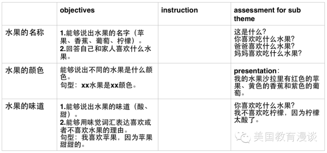 评量方式就是老师给学生水果,学生可以说出水果的名字。中间的课程活动用什么游戏,这个每个老师都有不同的方法,但是必须牢记,活动的目的是为了让学生能够说出水果的名字。为了达到这个目标,我们要先进行输入(comprehensive input),再进行输出(output)。