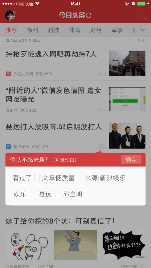 今日头条给予了用户充分的筛选空间,对不喜欢的文章被删选时也提供了多种可选择理由。在用户使用过程中用户由于理由选择的动作会对产品有一个智能化的印象分。