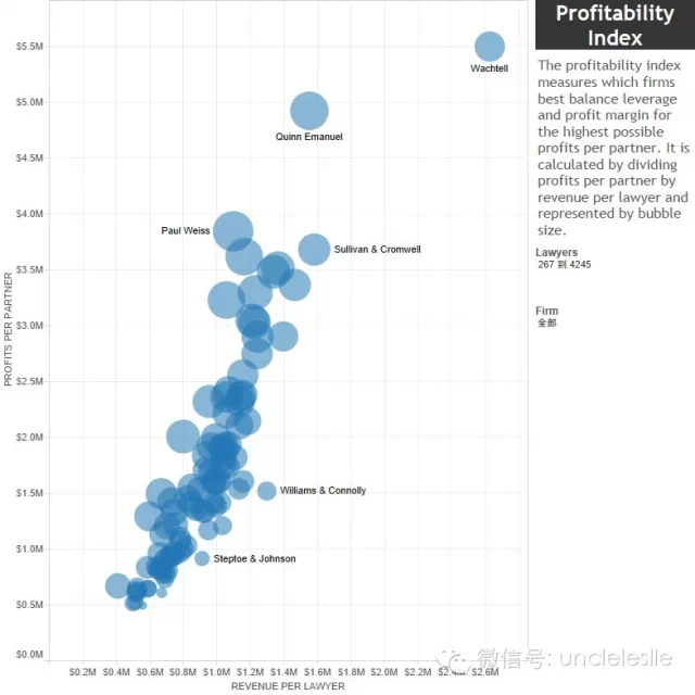 其中,顶级富所当然非每个合伙人能赚取550万美元以上的Wachtell莫属,紧跟其后的便是诉讼牛所Quinn Emanuel,每个合伙人能赚到490万美元以上,再接下来便是DPW,Cravath,Kirkland,Paul Weiss,Sullivan等华尔街顶级律所,每个合伙人能赚到300万美元以上。