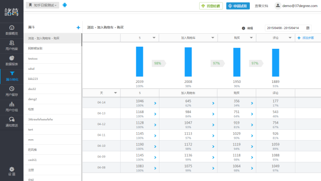 在关注用户行为的同时,诸葛IO还引入了在电商行业经常被提及的“漏斗转化”功能。开发者可以预设一个用户使用场景,并为其建立检测漏斗,其后,便可每天通过诸葛的后台监测该场景各步骤的转化率了。