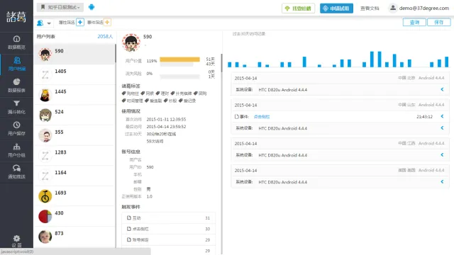 所有的用户的访问时长、历史30天访问频次、事件触发表现、设备机型、登录地区、什么时间进行了什么操作……等等一系列详细的数据信息一览无余。足可见诸葛IO对用户行为数据的关注程度之深。