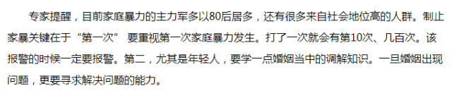 家暴,已经不再是家事、私事,不是家丑,是犯罪。为了让您的孩子不成为家暴目睹儿童受害者,请您就算是为孩子,也要行动起来,一味的忍让只会让施暴者变本加厉。且看下面这位女白领施暴的理由![]()