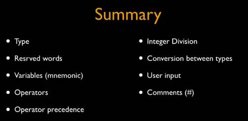 注意,写这个笔记的时候我用python测验了下,我原本写的是x = float(99/100), 这时输出的结果会是0.0,而不是0.99, 因为python优先计算括号里的值,而99/100的值是integer 0,然后再转换成float,就只会是0.0, 而不是0.99. 感觉真是意外收获,上课没遇到这个问题,写笔记时居然遇到了,增强记忆和复习,另外,学python等编程语言,随时不懂就去软件里编一段验证,真的是最快的自主学习方式。